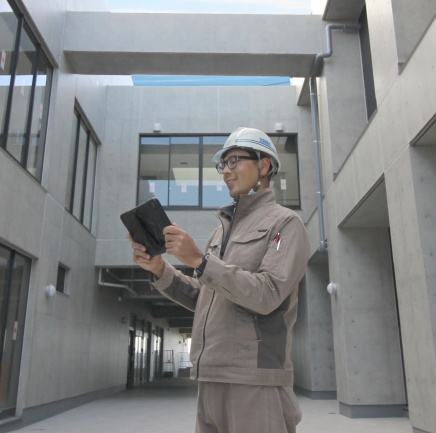 A私は今年で勤続8年目になります。現在は小学校の新築工事のジョイント・ベンチャー(複数の企業が共同で行う事業)で施工管理を担当しています。当社の魅力は、大きな規模の工事を任されることが多く、成長スピードが非常に早いことと、家庭的な雰囲気で、何か困っても周りの誰かが必ず手を貸してくれるところです。これまで関わった工事でもっとも印象に残っているのが、伊勢総合病院の新築工事でした。大規模な救急病院の建設で、スーパーゼネコンとのジョイント・ベンチャーだったため、初めての工法や、IoTを駆使するなど、多くのことを吸収することができました。この現場をきっかけに、タブレットの導入を自分の会社に提案したところ、すぐ全員にタブレットが支給され、現場の作業効率が飛躍的に向上しました。若手社員の声もしっかり聴いてもらえ、積極的に新しいことを取り入れてくれました。