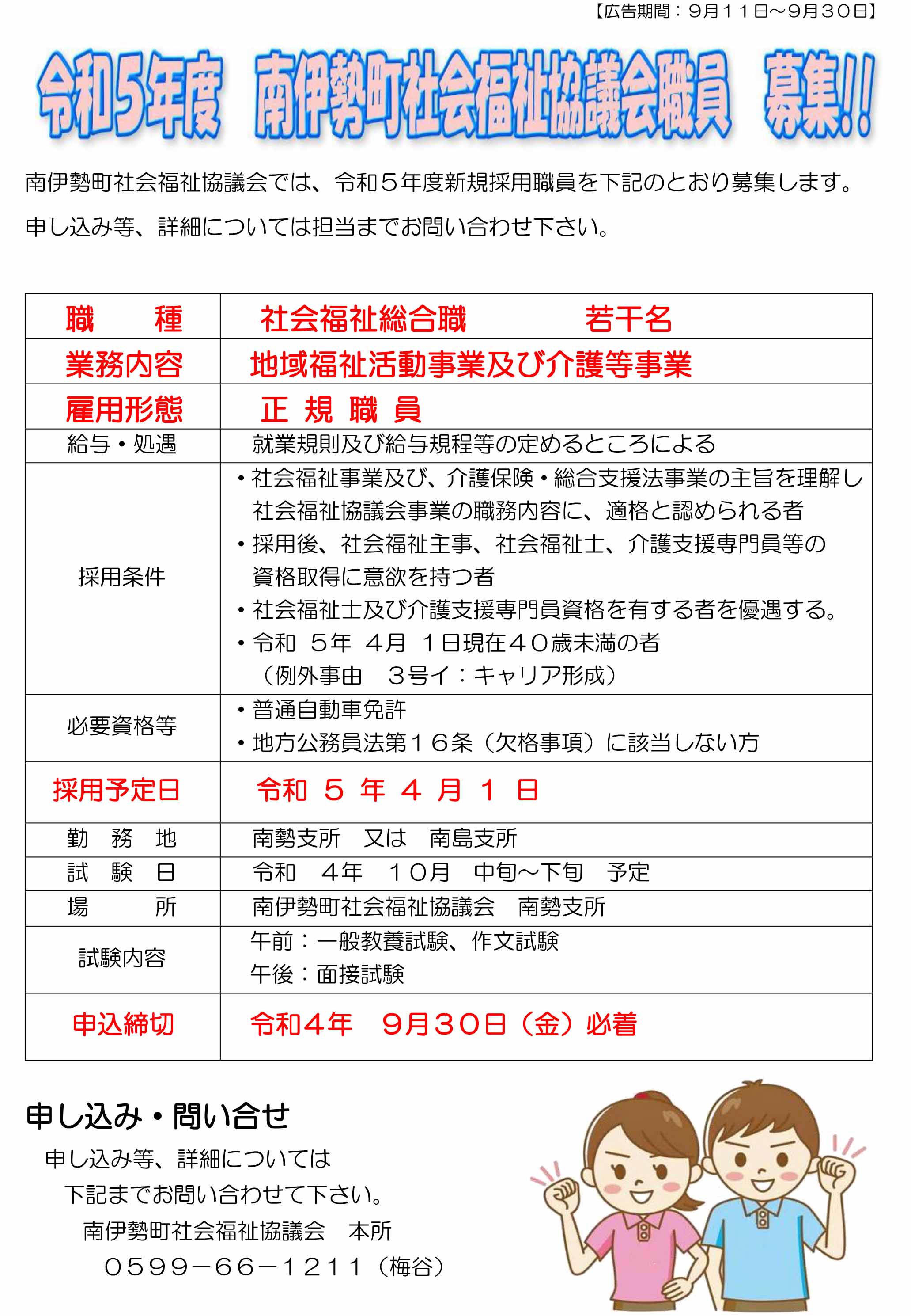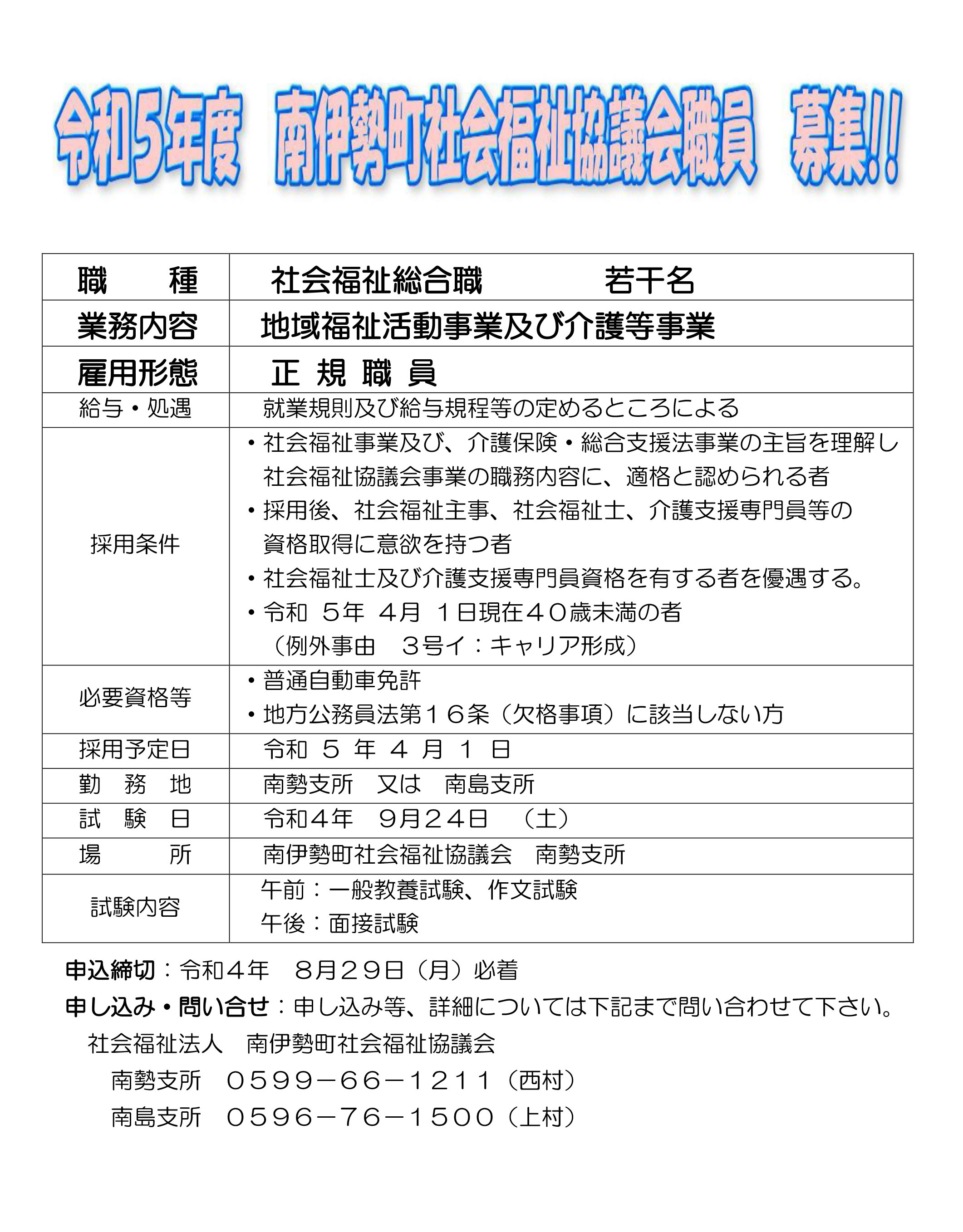 南伊勢町社会福祉協議会では、令和5年度新規採用職員を下記のとおり募集します。