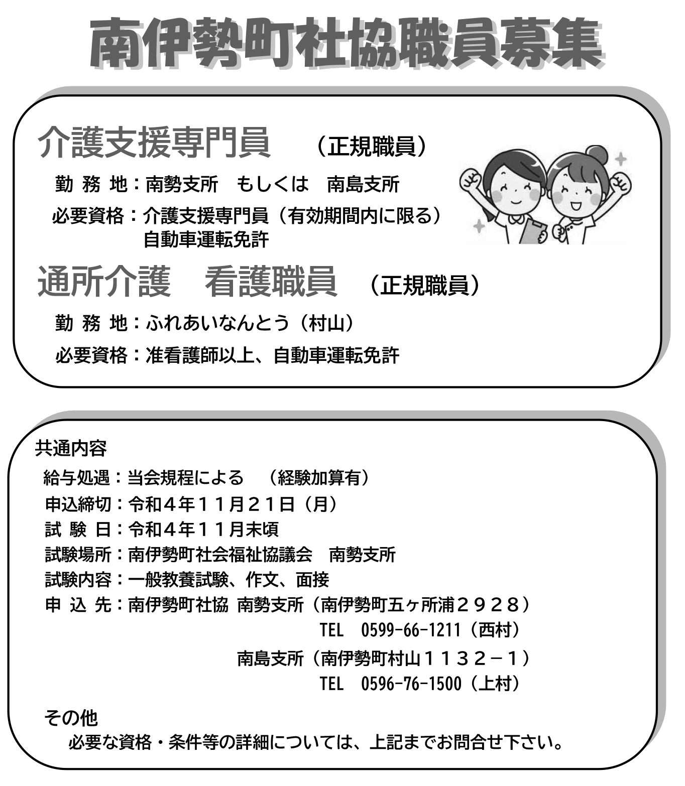 南伊勢町社会福祉協議会では、地域のケアマネージャー不足の現状ニーズを踏まえ、ケアマネージャーの増員を図るため、下記のとおり募集をします。