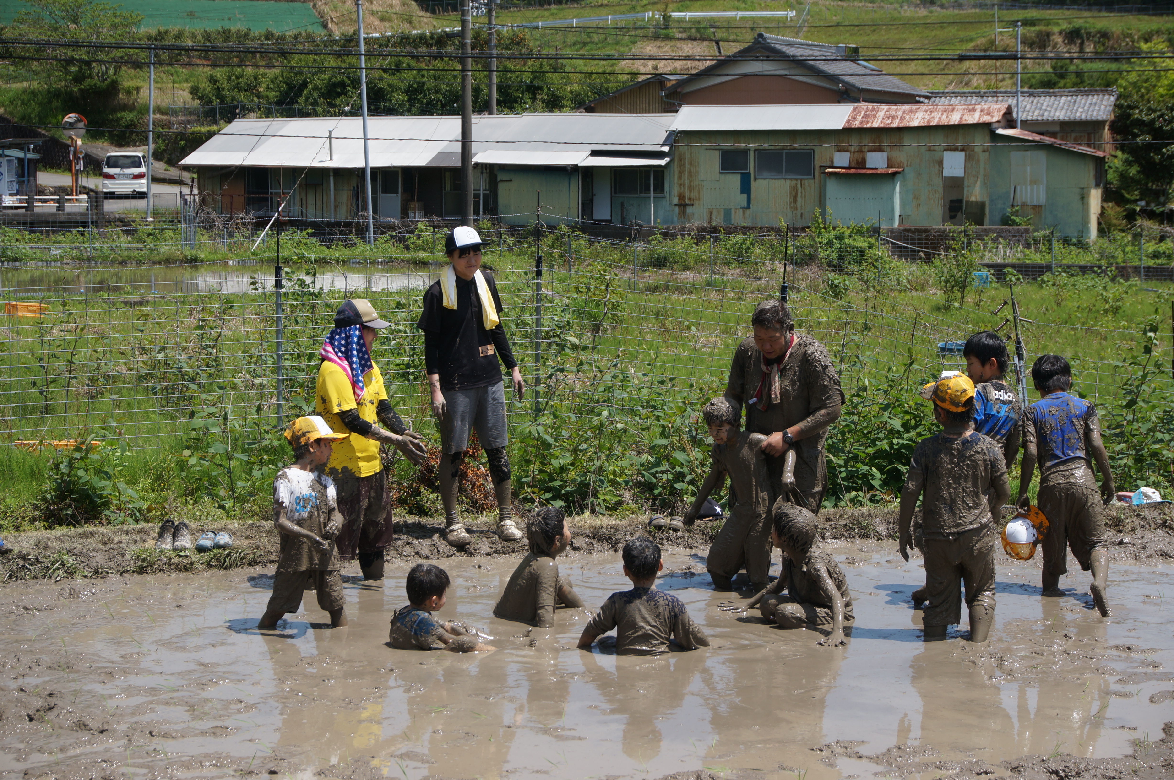 大人も子どもも全身泥だらけになって田を混ぜ、手植えで苗を植えています。