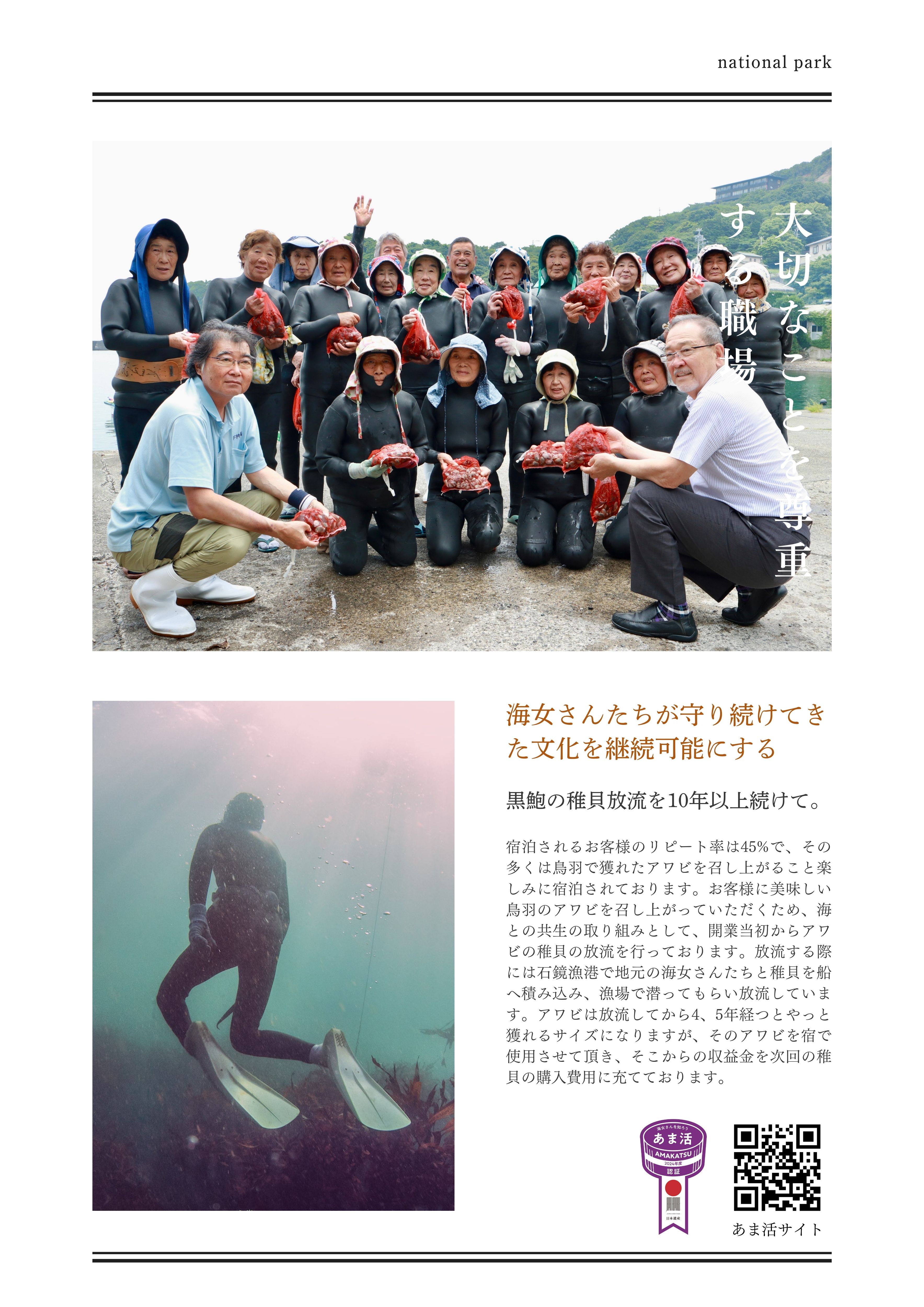 宿泊されるお客様のリピート率は45%で、その多くは鳥羽で獲れたアワビを召し上がること楽しみに宿泊されております。お客様に美味しい鳥羽のアワビを召し上がっていただくため、海との共生の取り組みとして、開業当初からアワビの稚貝の放流を行っております。放流する際には石鏡漁港で地元の海女さんたちと稚貝を船へ積み込み、漁場で潜ってもらい放流しています。アワビは放流してから4、5年経つとやっと獲れるサイズになりますが、そのアワビを宿で使用させて頂き、そこからの収益金を次回の稚貝の購入費用に充てております。