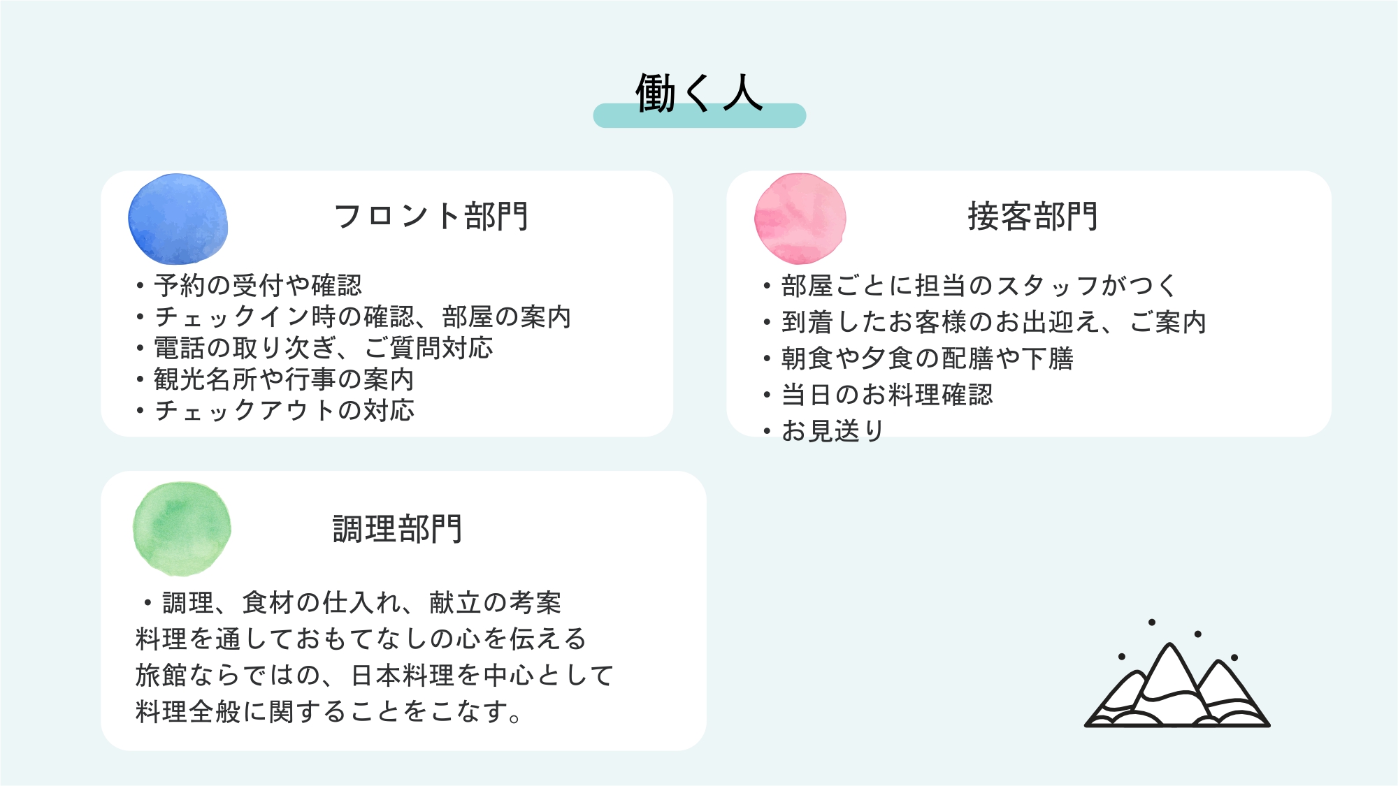 旅館では大きく分けて、3つの部門がございます。