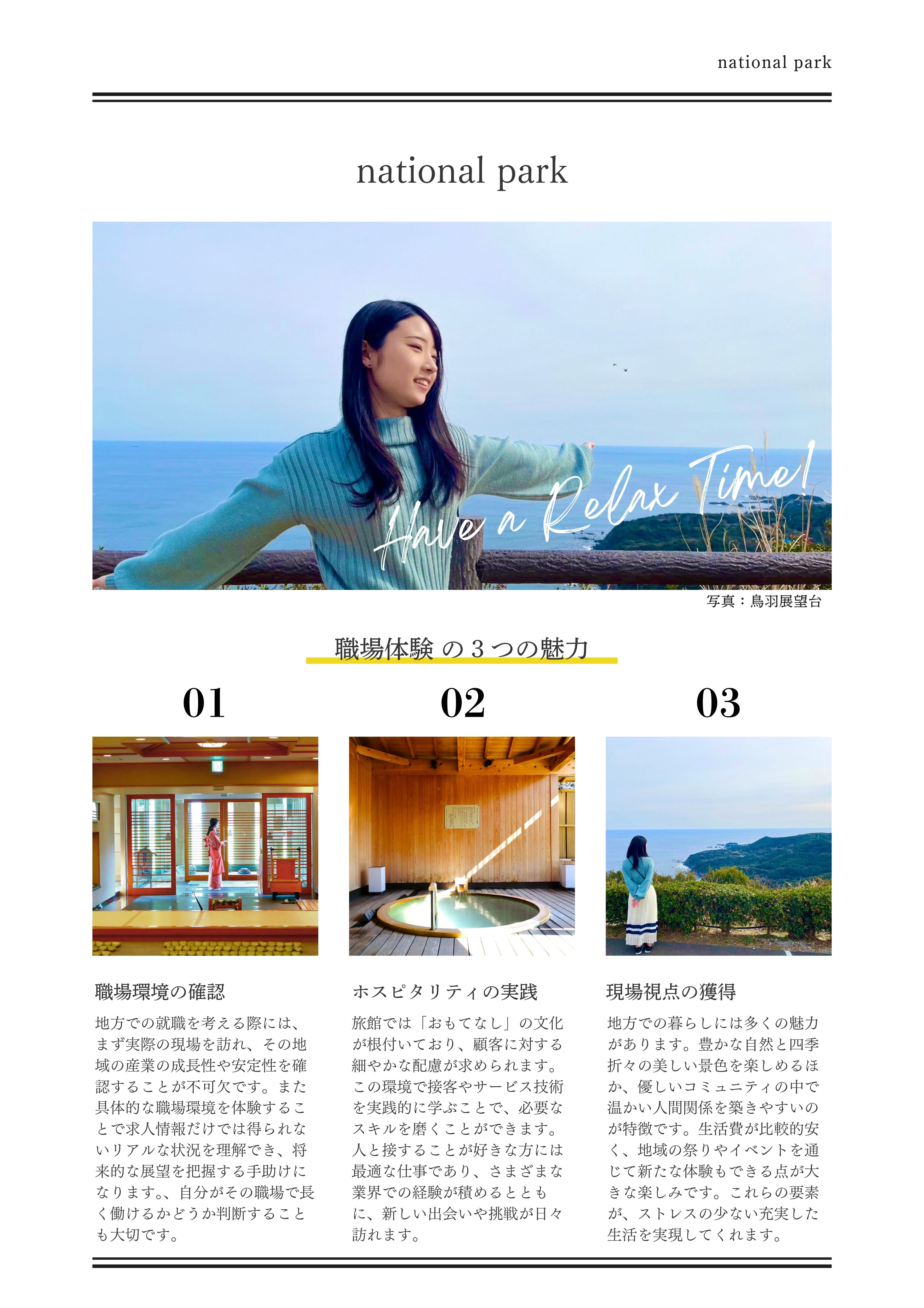 国立公園内の職場で働く魅力は、自然の美しさを感じながらお客様に心温まるおもてなしができる点でございます。四季折々の風景や地元食材を活かしたお料理を提供することで、食を通じて感動を生み出すことができます。また、チームワークを重視し、同僚との絆を深めることで人間関係も豊かになります。観光地ならではの体験を通じて訪れるお客様の笑顔を感じつつ、自身の成長を実感できる環境は、まさに人生において貴重な財産となるでしょう。