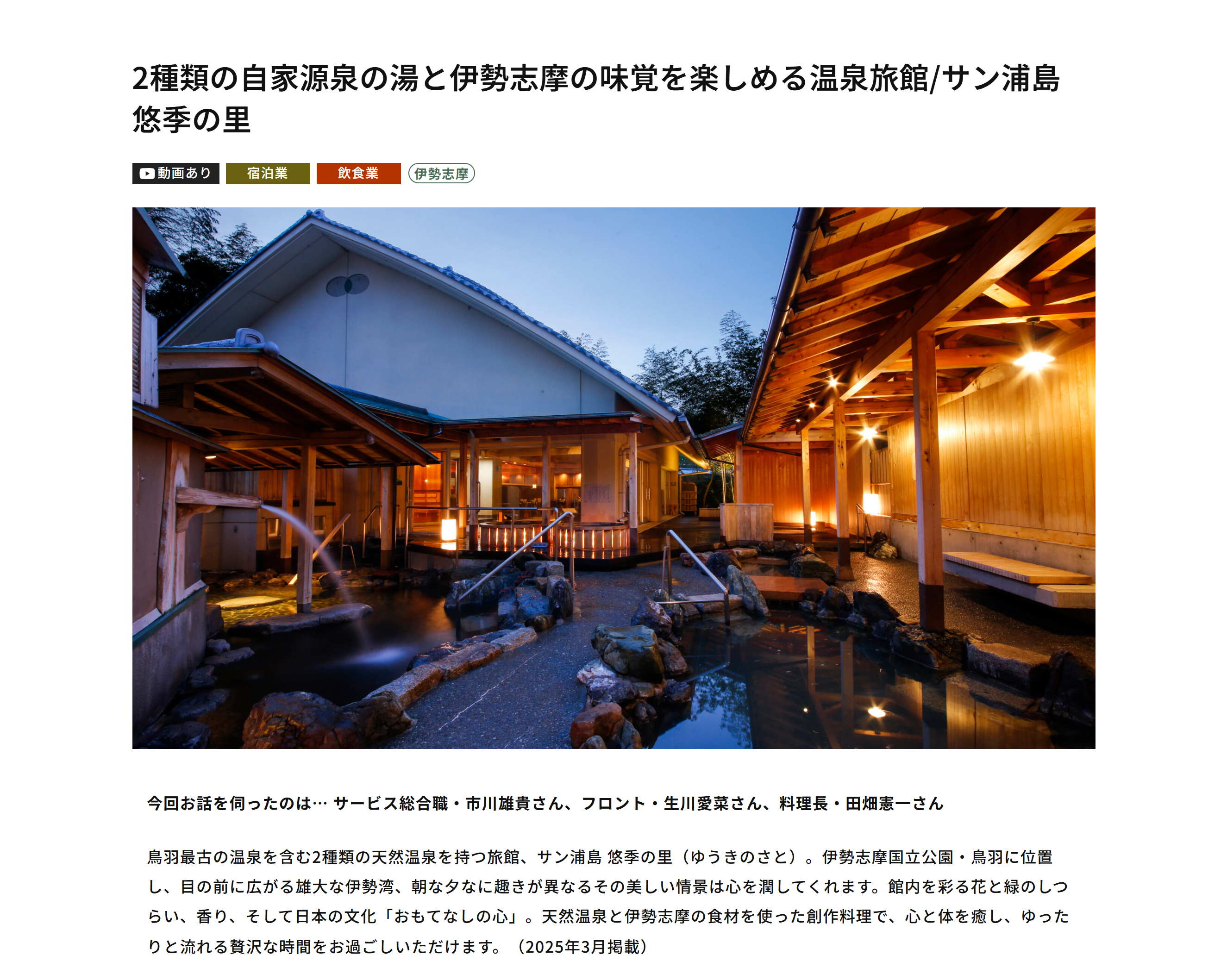 鳥羽最古の温泉を含む2種類の天然温泉を持つ旅館、サン浦島 悠季の里(ゆうきのさと)。伊勢志摩国立公園・鳥羽に位置し、目の前に広がる雄大な伊勢湾、朝な夕なに趣きが異なるその美しい情景は心を潤してくれます。館内を彩る花と緑のしつらい、香り、そして日本の文化「おもてなしの心」。天然温泉と伊勢志摩の食材を使った創作料理で、心と体を癒し、ゆったりと流れる贅沢な時間をお過ごしいただけます。(2025年3月掲載)