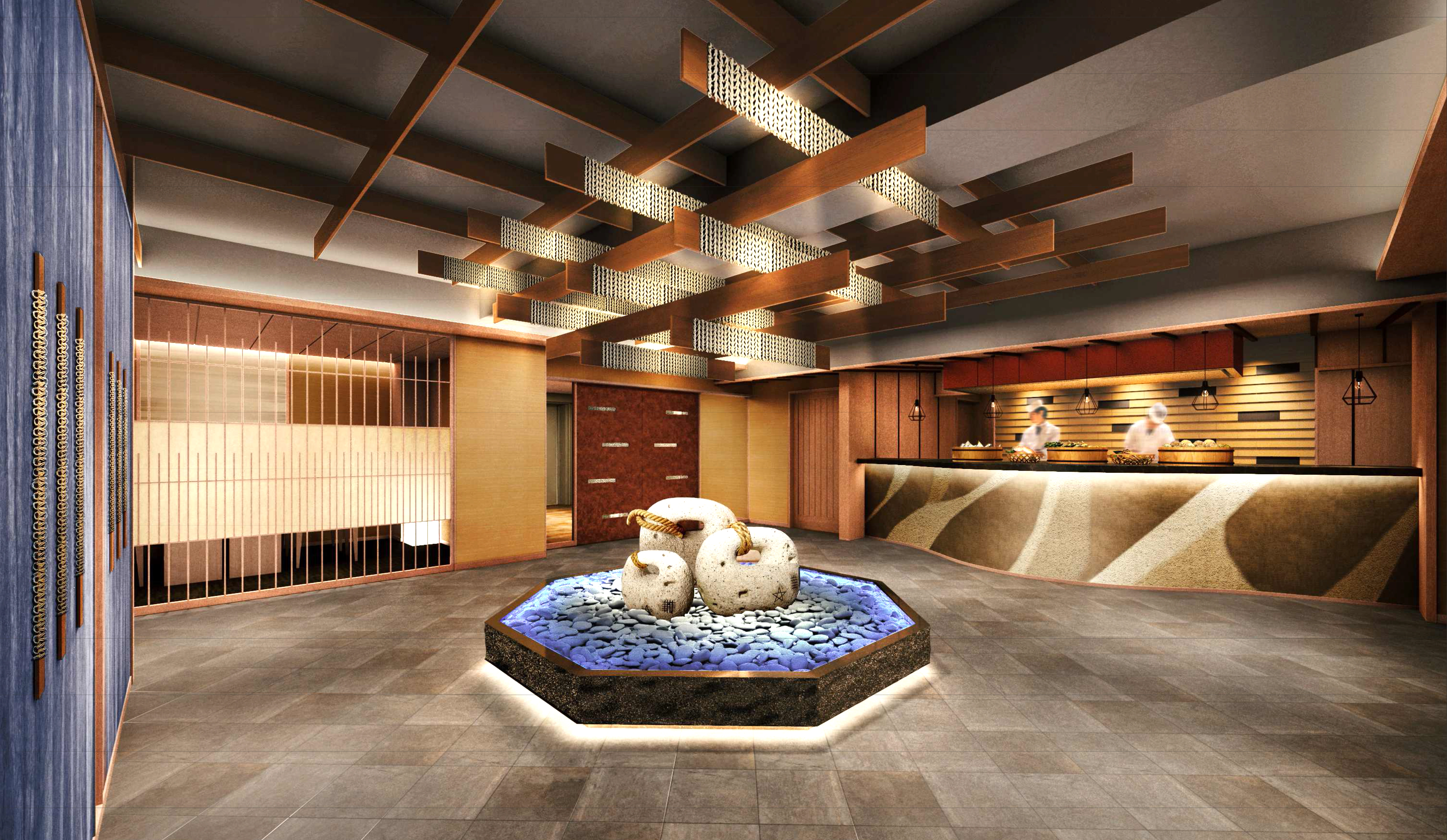 調理師の方々がお客様に見えるオープンキッチンで働く様子をご覧いただける、サン浦島悠季の里のダイニング「風姿花伝」が、リニューアル改修を経て、この春の3月よりオープンいたします。