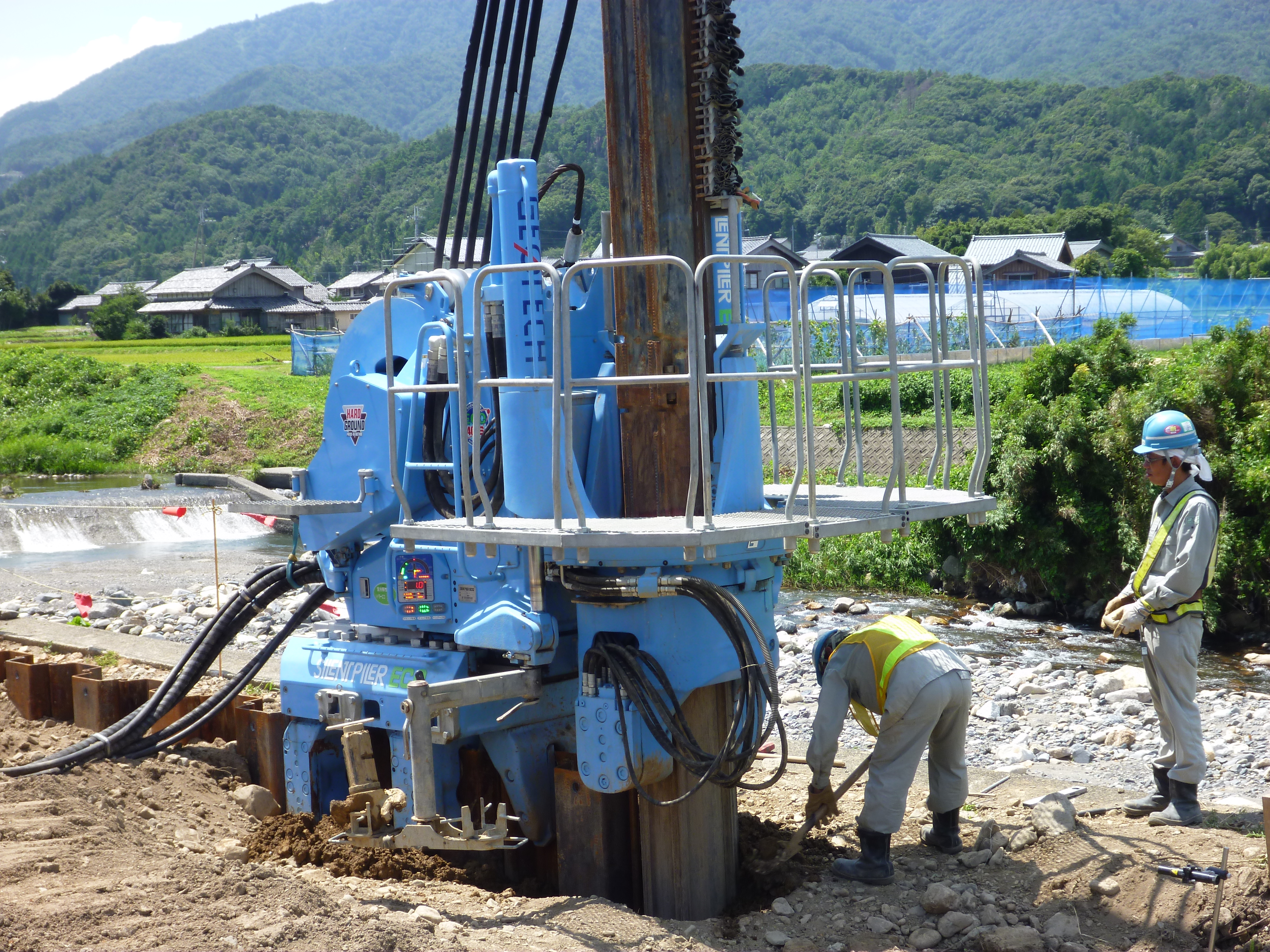 当社は、川や海の護岸、高速道路や下水道をつくる上で欠かせない【鋼矢板工事】を専門に行う建設会社です。【サイレントパイラー】という、杭打ち機を使用し、振動・騒音公害のない、安全な工事を行っています。
