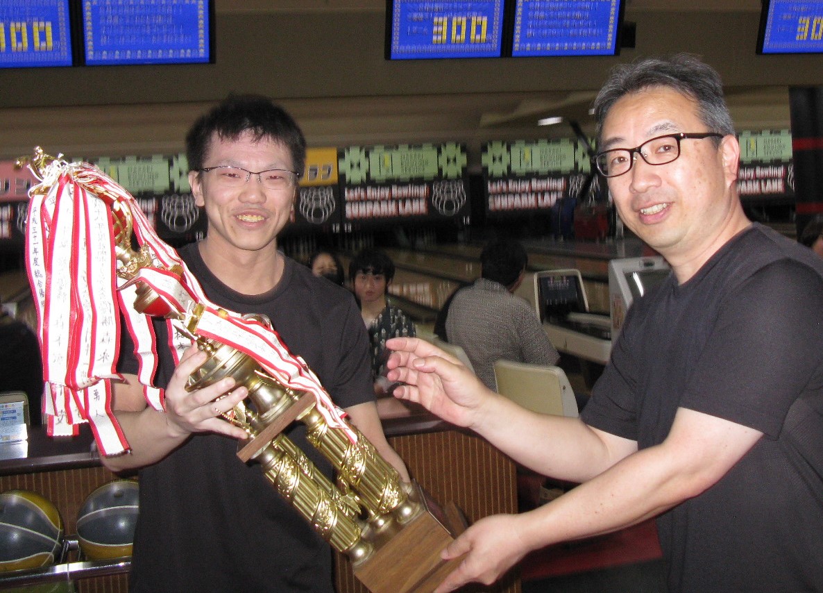 社長挨拶で始まり、2ゲーム実施し合計得点で順位を競い、総合優勝は、2021年新入社員の自動車部品事業部第一課・川端武広さん合計383点!トロフィーと賞品を授与(写真は広瀬社長よりトロフィー授与)、また、新入社員の部の優勝とハイゲーム196点と嬉しいトリプル受賞となりました。