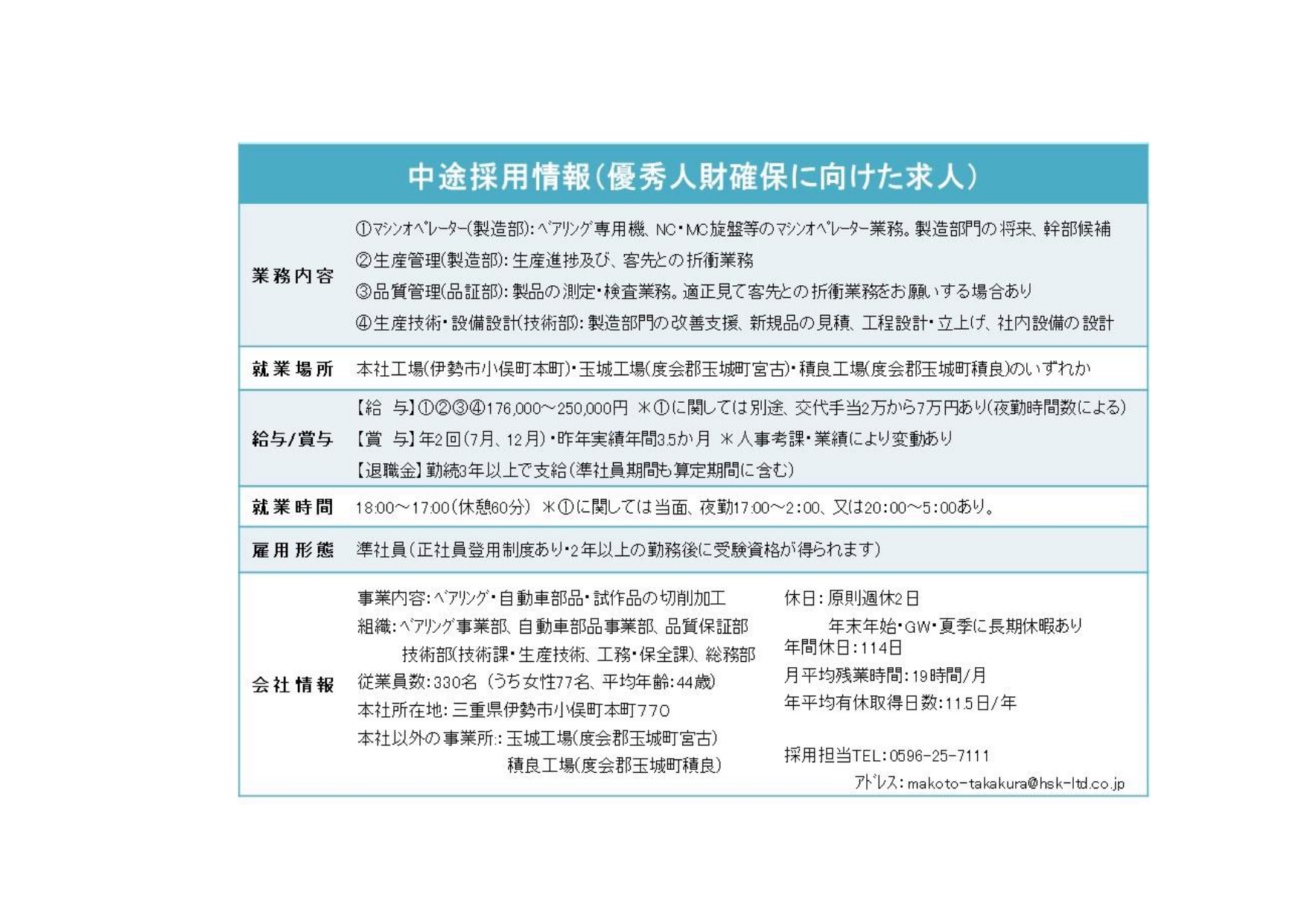 興味のある学生は、メール(makoto-takakura@hsk-ltd.co.jp)又は、電話(0596-25-7111)にてご連絡お待ちしています。